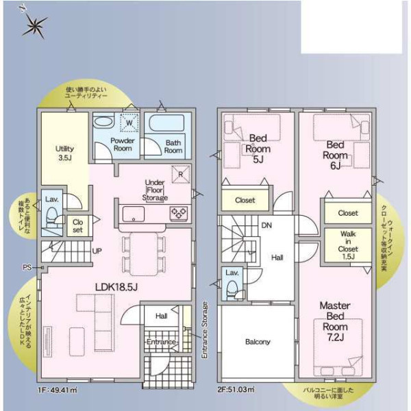 | 設備 | 都市ガス、電気、上水道、下水道、システムキッチン、カウンターキッチン、浄水器、給湯、トイレ2箇所、温水洗浄便座、シャンプードレッサー、浴室乾燥機、照明器具付き、ルーフバルコニー、収納スペース、ウォークインクローゼット、床下収納、モニタ付インターホン、火災警報器等設置済、建設住宅性能評価取得(予定含む) | ||